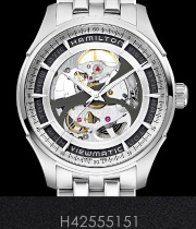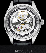 1957年、世界初の電池式時計という画期的な機構と左右非対称の先鋭的なフォルムで登場したベンチュラ。1970年、世界初のLED式デジタル機構と近未来的なデザインで時計の常識を塗り変えたパルサー。そして、スイスに拠点を移した近年の進化を物語る自動巻きデジタルウォッチパルソマティックなど、時代の先をゆくテクノロジーとその革新性を象徴する斬新なデザインで、ハミルトンは時計史に数々の足跡を残してきました。2013年バーゼルコレクションでは、技術とデザインの真価が問われるフルスケルトン仕様の新作が登場。スイスETA社と共同開発したハミルトンのエクスクルーシブ(専用)ムーブメント H-20-Sを搭載したタイムピース、ジャズマスター ビューマチック スケルトンが誕生します。