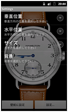 腕時計形のライブ壁紙として、時刻を表示します。時計のサイズや配置、背景などを選ぶことができます。