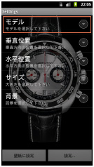メニューの「SIZE」を選択すると、端末の解像度情報を元に実際の腕時計のサイズ(ケース幅46mm)で時計が表示されます。